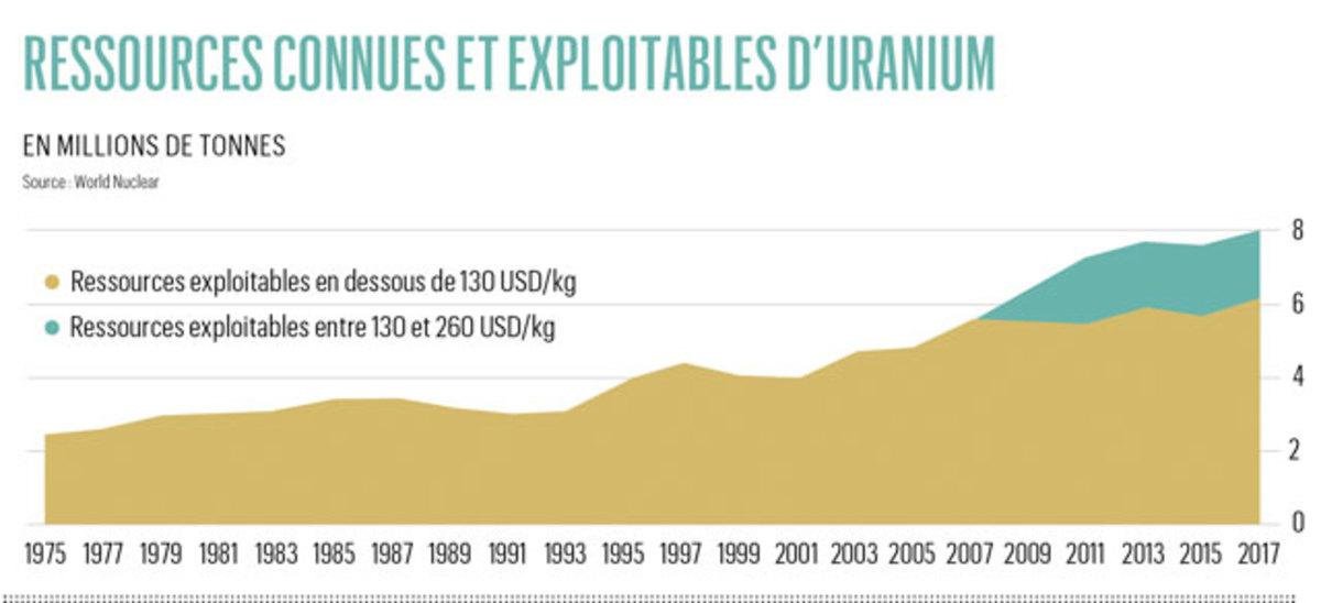 Selon World Nuclear, cette offre secondaire va se tarir à l’avenir, ce qui devrait progressivement à nouveau tendre le marché de l’uranium. D’autant plus que les investissements dans la production ont fortement baissé. La chute des cours “a provoqué non seulement une forte diminution des activités d’exploration de l’uranium (de 77%, passant de 2,12 milliards de dollars en 2014 à 483 millions en 2018), mais aussi la réduction de la production d’uranium dans les mines existantes, plus de 20.500 tonnes de production annuelle étant mises l’arrêt”. On notera ainsi que les réserves d’uranium sont certes abondantes mais basées sur des prix relativement plus élevés de 130 ou 260 dollars par kg d’uranium, ce qui correspond respectivement à 50 et 100 dollars la livre d’octaoxyde de triuranium.