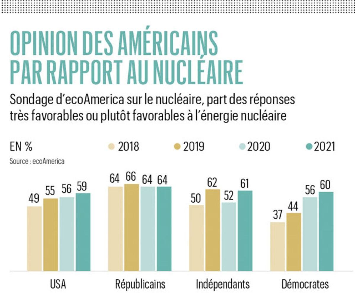 Ce soudain retour en grâce du nucléaire est notamment à mettre en parallèle avec l’évolution de l’opinion publique concernant l’énergie atomique. Tout particulièrement aux Etats-Unis où la part des personnes très favorables ou plutôt favorables à l’énergie nucléaire est passée en trois ans de 49% à 59% avec une évolution particulièrement marquée parmi les démocrates, comme vous pouvez le constater dans le graphique ci-dessous.